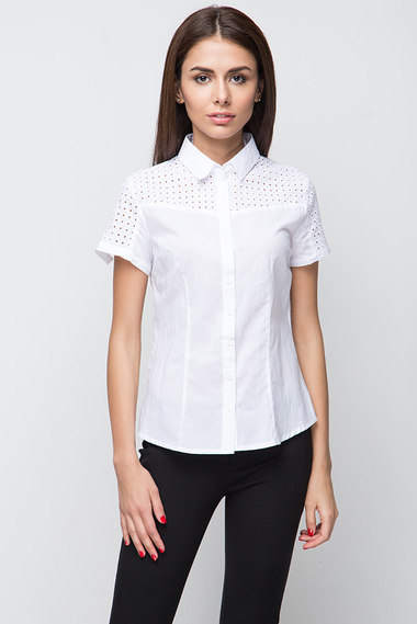 Белая хлопковая блузка с короткими рукавами. Модель Классическая на планке с пуговицами и с ажурными сетчатыми вставками на рукавах и плечах.